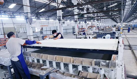 在广西碳歌环保新材料股份有限公司烧成车间,工人正在对陶泥浆粉进行定型、烘干操作,生产发泡陶瓷保温板。(图片来源于梧州日报)